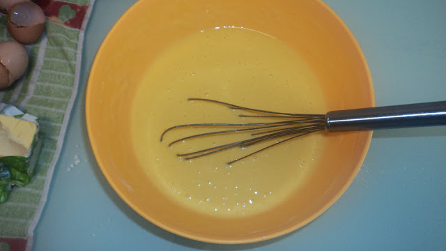 - Numa bacia juntar os ovos e o açúcar (usei areado) e misturar com a batedeira eléctrica