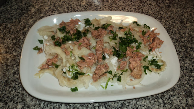 Bem sei que as festas Natalícias foram recentes e que a maior parte de vocês devem ter comido bacalhau nestas épocas, mas cá em casa pratos em que se usa o fiel amigo nunca são demais e por isso, na semana seguinte aos festejos do Ano-Novo eis que fiz uma salada de grão de bico e bacalhau com uns lombos de bacalhau previamente cozidos e lascados, que dá sempre um sabor bastante mais apetitoso que as cuvetes de bacalhau desfiado.